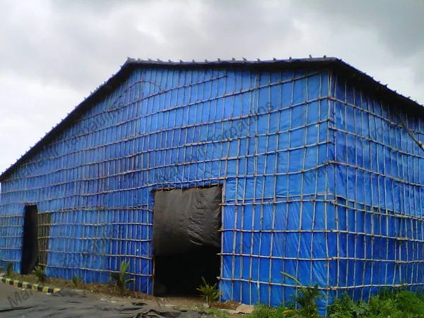 Shed's basic structure is made from wooden bullies, roof & side structure made with bamboos & coir ropes, then it covered with waterproof HDPE Tarpaulins, for extra safety black plastic is used on tarpaulins. Now days we have started using M.S truss for huge spans for vehicles or forklift movement where ever required.