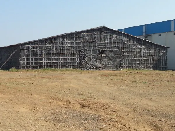 Shed's basic structure is made from wooden bullies, roof & side structure made with bamboos & coir ropes, then it covered with waterproof HDPE Tarpaulins, for extra safety black plastic is used on tarpaulins. Now days we have started using M.S truss for huge spans for vehicles or forklift movement where ever required.